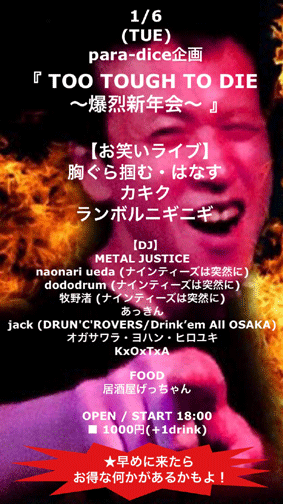 TOO TOUGH TO DIE~爆裂新年会~ 【 DJ 】 METAL JUSTICE naonari ueda (ナインティーズは突然に) dododrum (ナインティーズは突然に) 牧野渚 (ナインティーズは突然に) あっきん jack (DRUN'C'ROVERS/Drink’em All OSAKA) オガサワラ・ヨハン・ヒロユキ KxOxTxA 【 お笑いライブ 】 胸ぐら掴む・はなす カキク ランボルニギニギ 【 FOOD 】 居酒屋げっちゃん OPEN /START 18:00 ■ 1000円 (+1drink) |