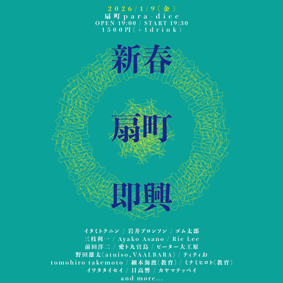 『 新春扇町即興 』 イタミトクニン / 岩井ブロンソン / ゴム太郎 / 三枝利一 / Ayako Asano / Rie Lee / 前田洋二 / 愛ト九官鳥 / ピーター大工原 / 野田雄太(atuiso、VAALBARA) / ティティお / tomohiro takemoto / 細木海渡(教育) / ミナミヒロト(教育) / イワタタイセイ / 日高響 / カヤマテッペイ and more...?