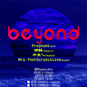 para-dice企画 『 beyond 』 OPEN 18:00 18:30 〜 19:10 Mrs.PoohScratchLove 19:25 〜 20:05 木魚人 20:20 〜 21:00 喃語 21:15 〜 21:55 Pregnant(USA) ■ 2500円 (+1drink) ■ 半券10枚 1000円引き ■ 学割 1000円引き |