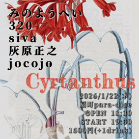 para-dice企画 『Cyrtanthus』 OPEN 18:30 19:00 〜 19:30 jocojo 19:40 〜 20:10 灰原正之 20:20 〜 20:50 siva 21:00 〜 21:30 320 21:40 〜 22:10 みのようへい ■ 1500 円 (+1drink) ■ 半券10枚 1000円引き ■ 学割 1000円引き |