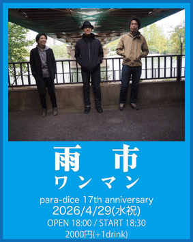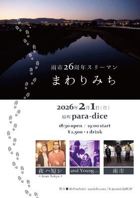 雨市26周年スリーマン 『まわりみち』 雨市 / 夜ハ短シ / and Young… OPEN 18:30 START 19:00 ■ 2500円 (+1drink) |