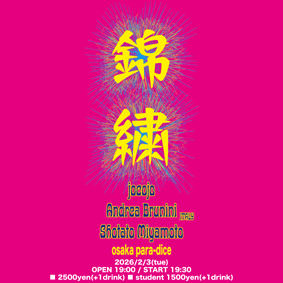 para-dice 企画 『 錦繍 』 OPEN 19:00 19:30 〜 20:10 Shotato Miyamoto 20:20 〜 21:00 Andrea Brunini(ITALY) 21:10 〜 21:50 jocojo ■ 2500円 (+1drink) ■ 半券10枚 1000円引き ■ 学割 1000円引き |
