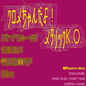 para-dice 企画 『 クロメちゃんだよ!メタリックK.O. 』 OPEN 18:30 19:00 〜 19:35 Qu 19:50 〜 20:25 怪我童子 20:40 〜 21:15 クロメ 21:30 〜 22:05 バイセーシ ■ 2300円 (+1drink) ■ 半券10枚 1000円引き ■ 学割 1000円引き |