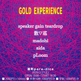 para-dice 企画 『 GOLD EXPERIENCE 』 OPEN 18:00 18:30 〜 19:00 pLoom 19:15 〜 19:45 aida 20:00 〜 20:30 madohi 20:45 〜 21:15 散▽巡 21:30 〜 22:00 speaker gain teardrop ■ 2000円 (+1drink) ■ 半券10枚 1000円引き ■ 学割 1000円引き |