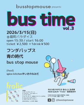 『 bustime03 』 bus stop mouse / 青の時代 / フンダパップス spice kitchen ずいきのなみだ OPEN 15:30 START 16:00 ■ 2500円 (+1drink) |