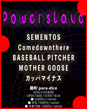 para-dice 企画 『 Powerslave 』 18:30 〜 19:00 カッパマイナス 19:10 〜 19:40 MOTHER GOOSE 19:50 〜 20:20 BASEBALL PITCHER 20:35 〜 21:05 Comedownthere 21:15 〜 21:45 SEMENTOS ■ 2500円 (+1drink) ■ 半券10枚 1000円引き ■ 学割 1000円引き |