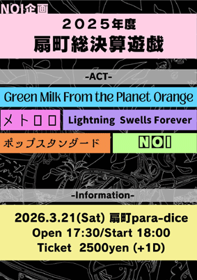 NOI企画 『 2025年度 扇町総決算遊戯 』 NOI / ポップスタンダード / Lightning Swells Forever / メトロロ / Green Milk From The Planet Orange OPEN 17:30 START 18:00 2500円(+1drink) |