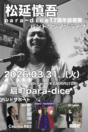para-dice17周年前夜祭 松延慎吾バンドワンマンライブ 出演: 松延慎吾 『サポート』 絶妙なアンバランズ Cecilia REI 豊田梵 OPEN 19:00 START 19:30 ■ 2500円(+1drink) |