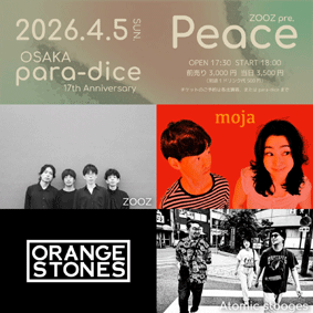 para-dice 17th Anniversary ZOOZ pre. 「Peace」 ZOOZ / moja / ORANGE STONES / Atomic stooges OPEN 17:30 START 18:00 ■ 3000 円 (+1drink) ■ 半券10枚 1000円引き ■ 学割 1000円引き |