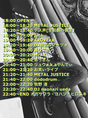 OPEN 18:00 18:30 〜 19:00 ホンジョウ 19:10 〜 19:40 karasuuri 19:50 〜 20:20 YAKIMON kids 20:30 〜 21:00 黒谷ギューン 21:10 〜 21:40 マッドショットガン 21:50 〜 22:20 ラッシュメンタルズ ■ 1500円 (+1drink) ■ 半券10枚 1000円引き ■ 学割 1000円引き |
