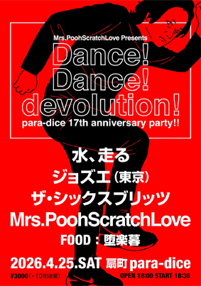 Mrs.PoohScratchLove Presents 【Dance!Dance!devolution!】 〜para-dice 17th anniversary party!!〜 Mrs.PoohScratchLove ジョズエ(東京) ザ・シックスブリッツ 水、走る FOOD 堕楽暮 OPEN 18:00 START 18:30 ■ 3000円 (+1drink) ■ 半券10枚 1000円引き ■ 学割 1000円引き |