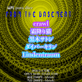 para-dice企画 『 FROM THE BASEMENT 』 OPEN 16:30 17:00 〜 17:40 Lindentraum 17:55 〜 18:35 ダイバーキリン 18:50 〜 19:30 黒木サトシ 19:45 〜 20:25 霜降り猫 20:40 〜 21:20 crawl ■ 前売 2500円(+1drink) ■ 当日 2800円(+1drink) ■ 半券10枚 1000円引き ■ 学割 1000円引き |