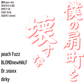para-dice 17th anniversary 豆鉄砲を撃ちまくれ!Season2 vol.1 ~㊗️扇町para-dice17周年編~ Obake-Numa2~after the night race ~ バンド喫茶 torobi neke OPEN 18:30 START 19:00 ■ 2000 円 (+1drink) ■ 半券10枚 1000円引き ■ 学割 1000円引き |